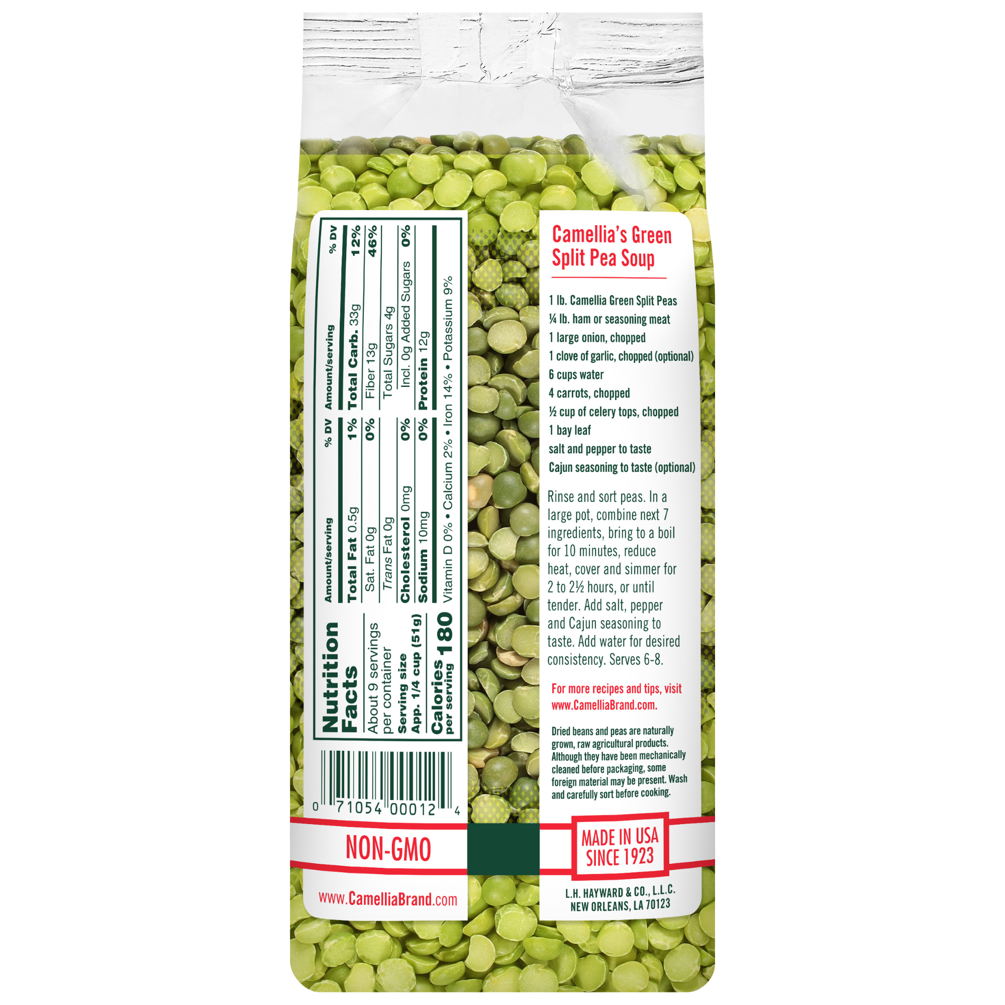 Green Split Peas are the mature form of green peas: the dried seeds of peas are peeled and then split, increasing the surface area of the pea. As a result, Split Peas don’t need to be soaked. They cook more quickly than whole peas, too! Like all of our beans, Camellia’s Green Split Peas are non-GMO, gluten-free, and meet the “Hayward Standard” – the name our growers gave our bean quality standard – which exceeds the top USDA requirements. Try some today – we think you’ll taste the difference.